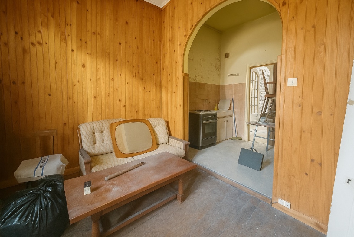 L’appartement duplex se situe au premier étage de cet ensemble immobilier. Il nécessite également des travaux de rénovation. Le séjour offre une surface de 29 m² tandis que la cuisine mesure 9 m². Par ailleurs, le bien comprend une chambre de 9 m² au rez-de-chaussée, une salle d’eau de 5 m² et un bureau de 6 m². En effet, un WC séparé complète cet appartement.